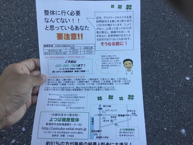「整体ネット」では、新潟県新潟市中央区にある「よつば健康整体」についてご紹介します。施設の所在地、交通アクセスはもちろん、営業時間、施術内容、施術にかかる料金といった施設情報を多数掲載。また、実際に来院されたご利用者様から寄せられた口コミ、投稿写真、投稿動画をご覧頂くことができるため、事前に施設の雰囲気を知ることもできます。そのほかにも、周辺施設情報、近くの賃貸物件情報も掲載中。よつば健康整体の情報を知りたいときにご利用いただけます。